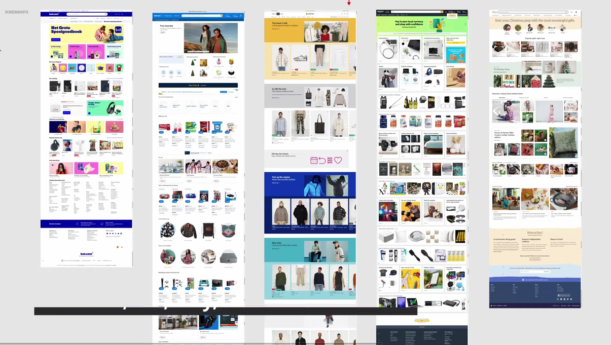 Amazon's, Bol's, Etsy's, Walmart's, and Zalando's Ecommerce Homepages