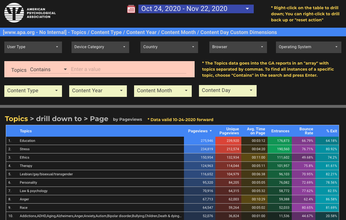 As part of the "Monthly GA/GSC Report" in Data Studio, a new report has been made to show the basic page metrics for some new custom dimensions that were set up in Google Tag Manager (GTM): Topics, Content Type, Content Year, Content Month, and Content Day.