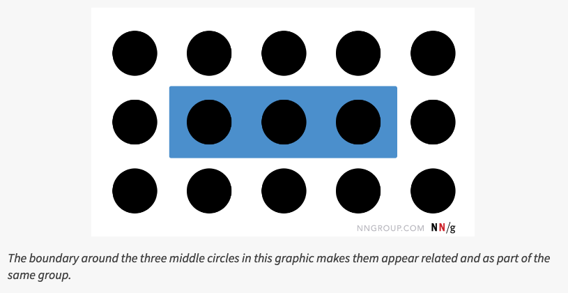 The original set of Gestalt principles was discovered in the first half of the twentieth century and includes proximity (which was mentioned in the 8-21-2020 issue of 5-Card Friday), similarity, and closure. Later research at the end of the twentieth century added a few more grouping principles to the list discovered initially by the Gestalt psychologists. Among these, perhaps the most relevant for UX is that of common region.
